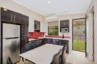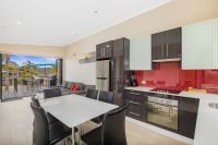 - Kitchen equipped with stainless steel appliances and a glass splashback