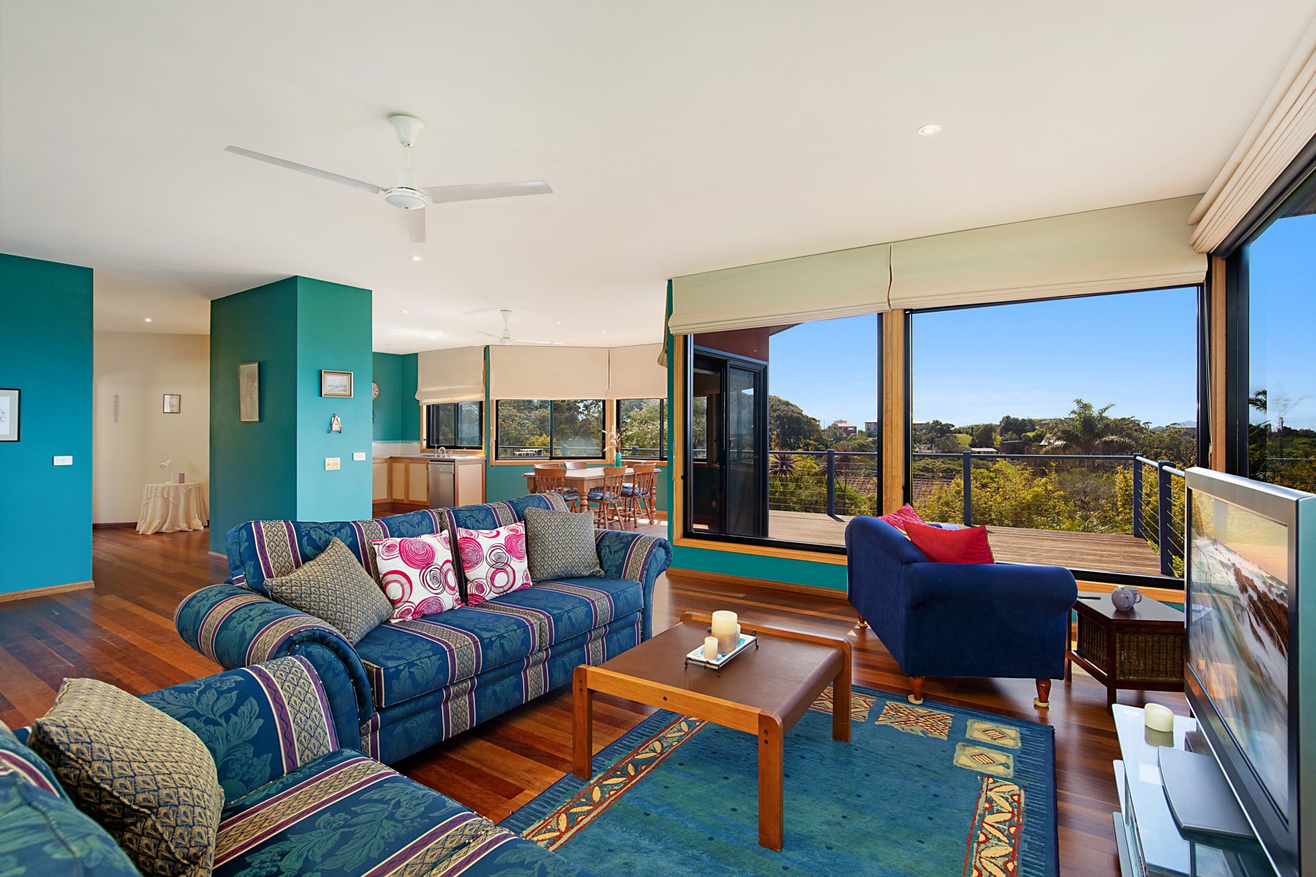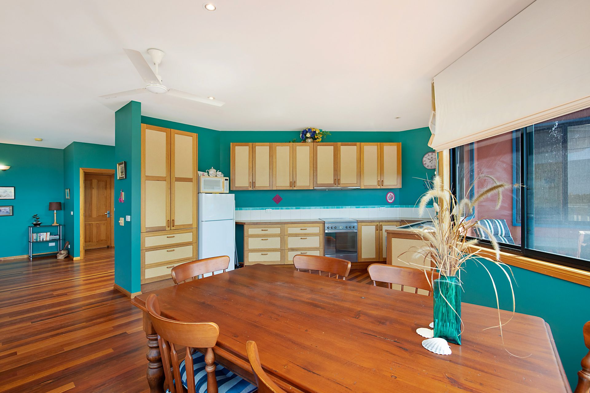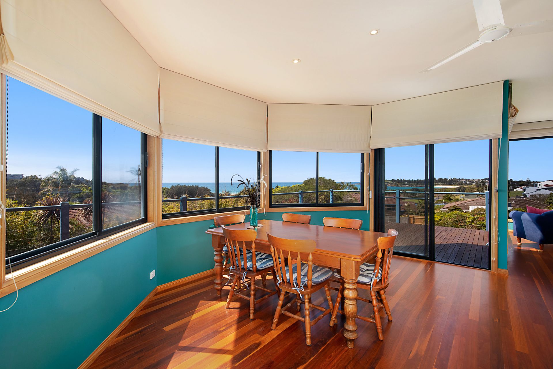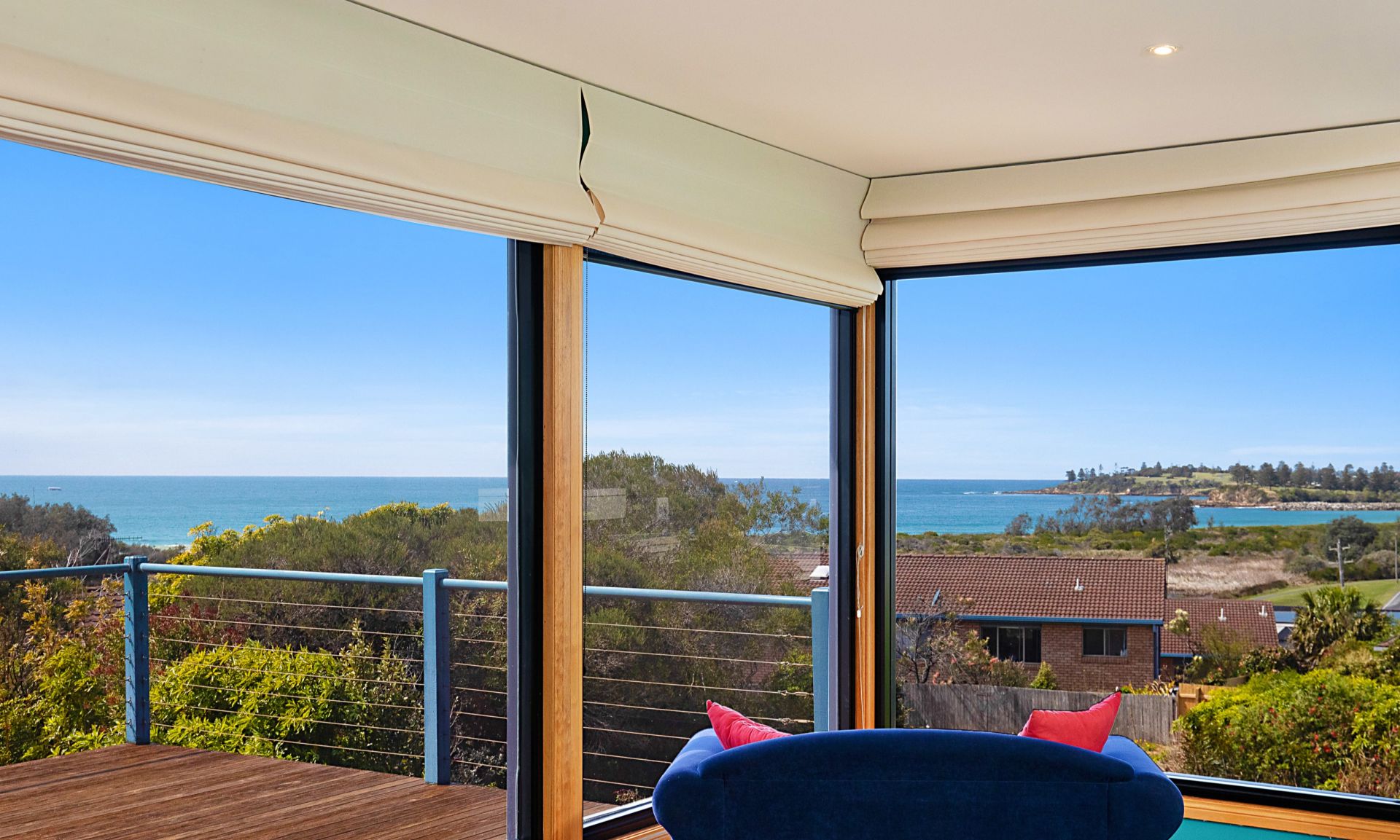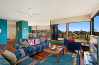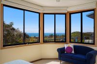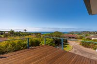 The expansive, sunlit open plan living and dining area boasts timber flooring and large picture windows that invite the outdoors in. Step onto the private deck to soak in the breathtaking views and catch glimpses of whales playing in the distance.