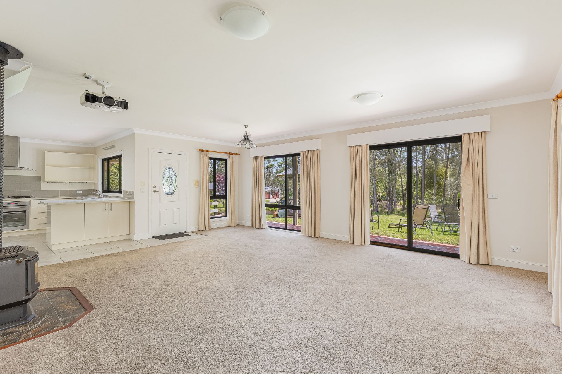 - Open-plan living area with a cosy slow-combustion wood heater
