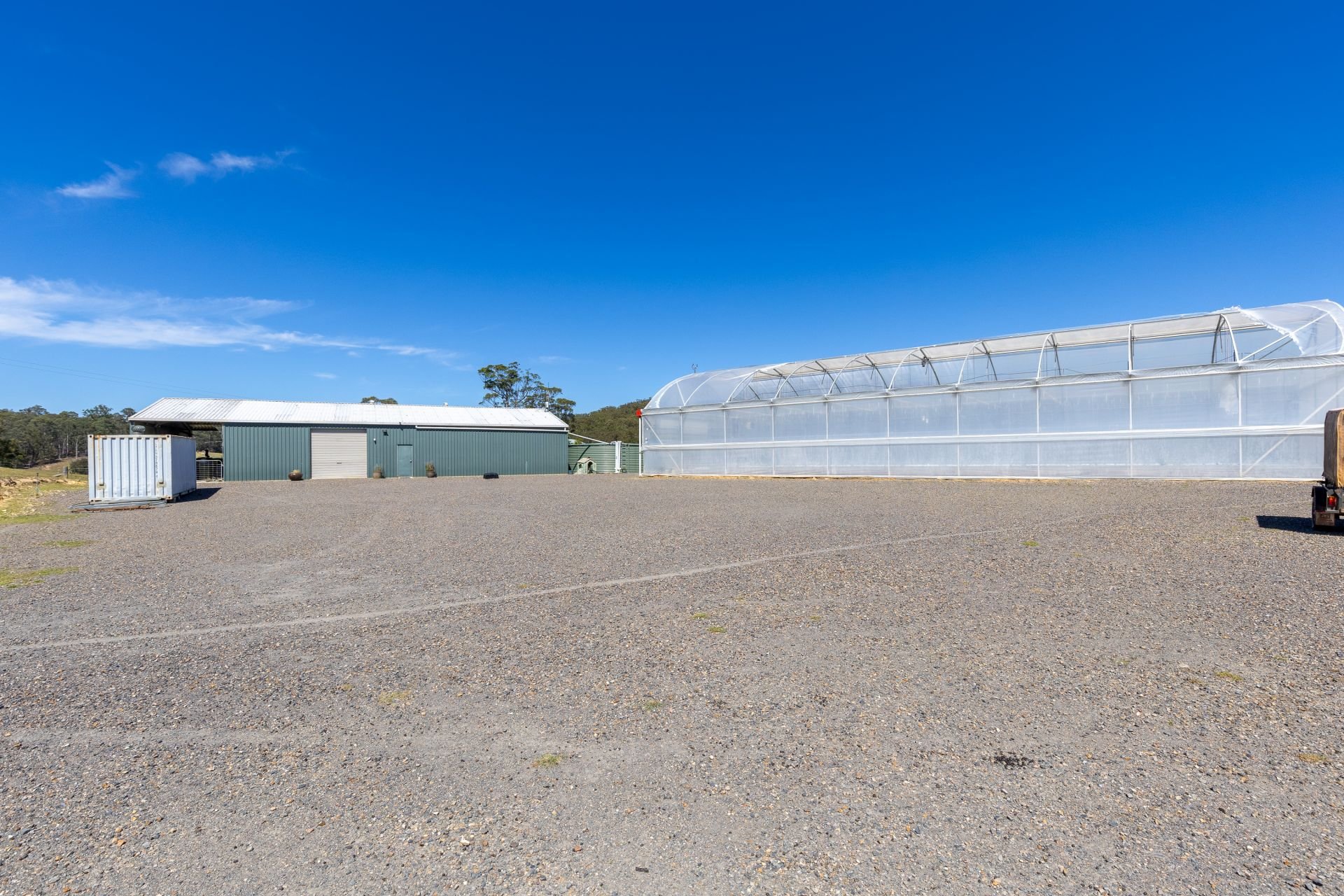 Infrastructure across the property is well established and highly functional, including a large shed on a concrete slab (power and water connected), cattle yards, and five commercial-scale greenhouses suitable for a wide range of potential growing options.