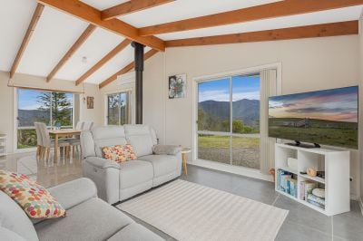 - Functional kitchen adjoins open-plan living and dining with wood heater and reverse cycle air conditioning for year-round comfort